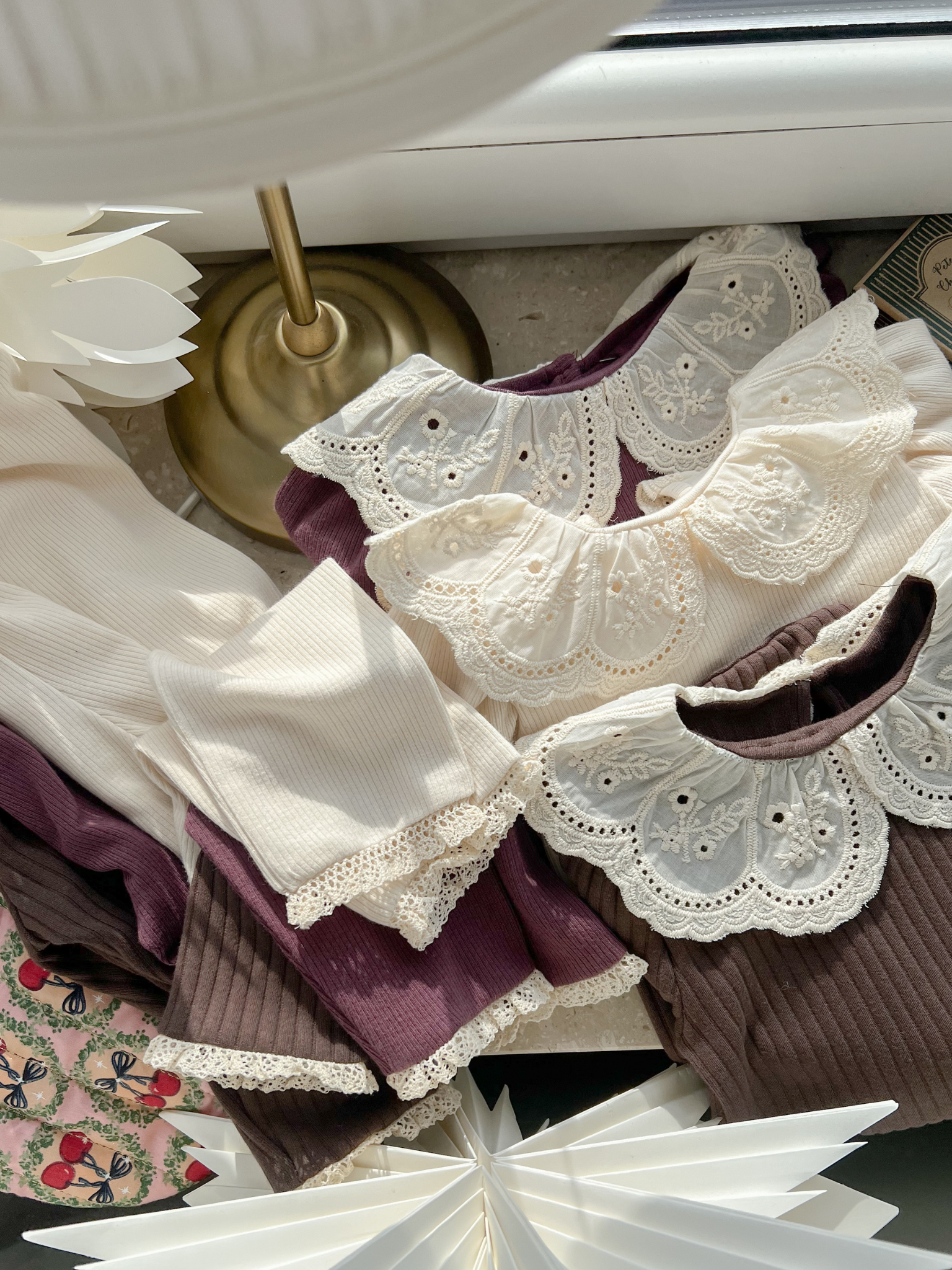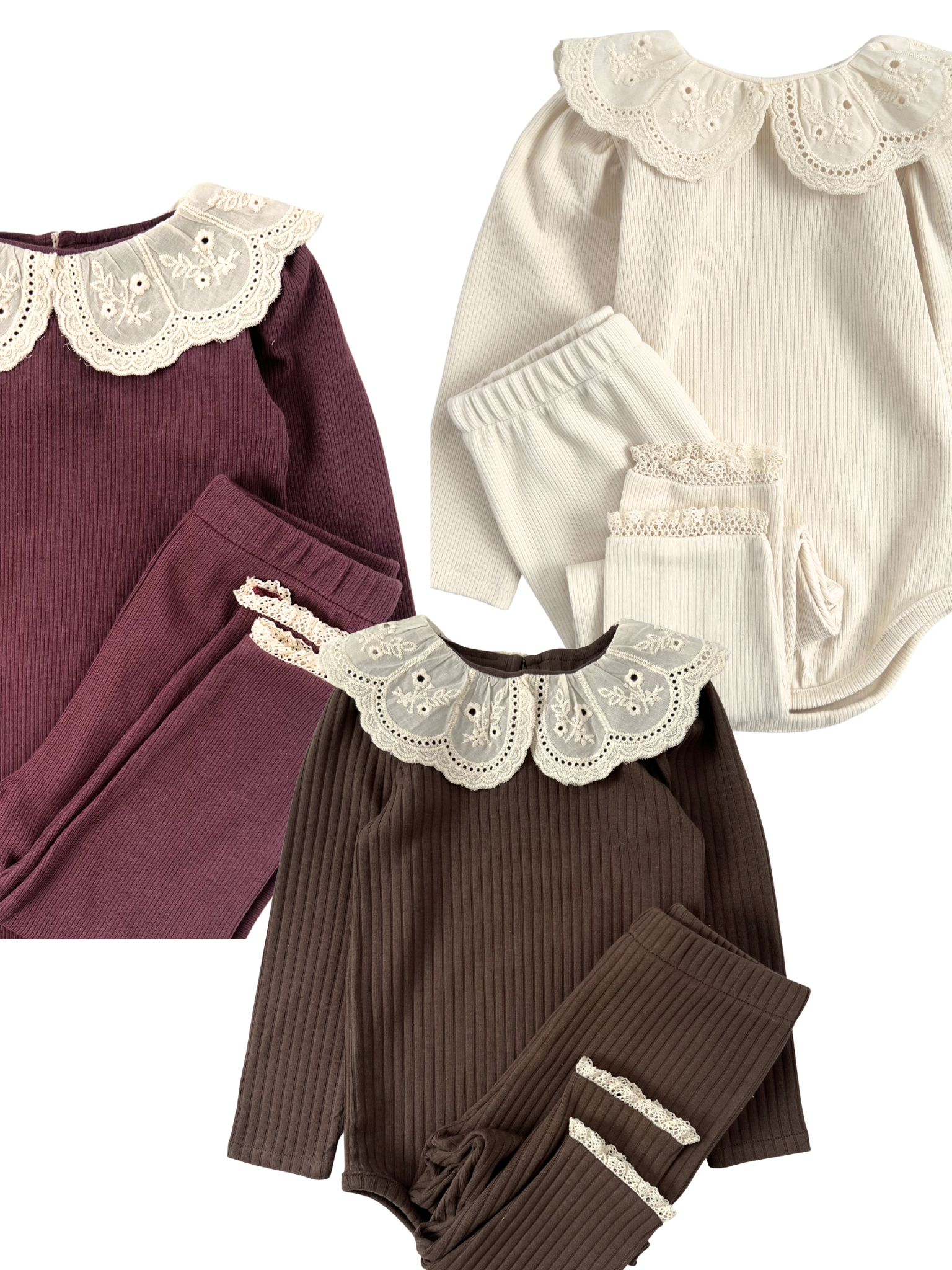 Legginsy i body z kolekcji winter edition, rozciągliwa dzianina, miękka guma w pasie, dekoracyjna koronka.