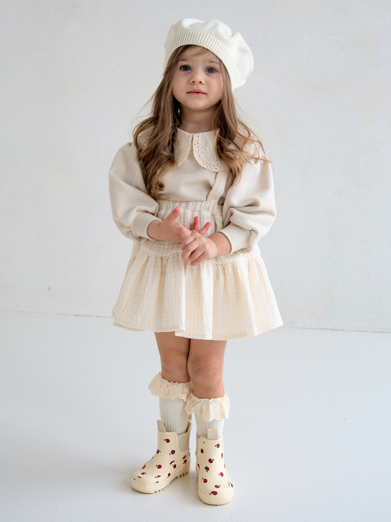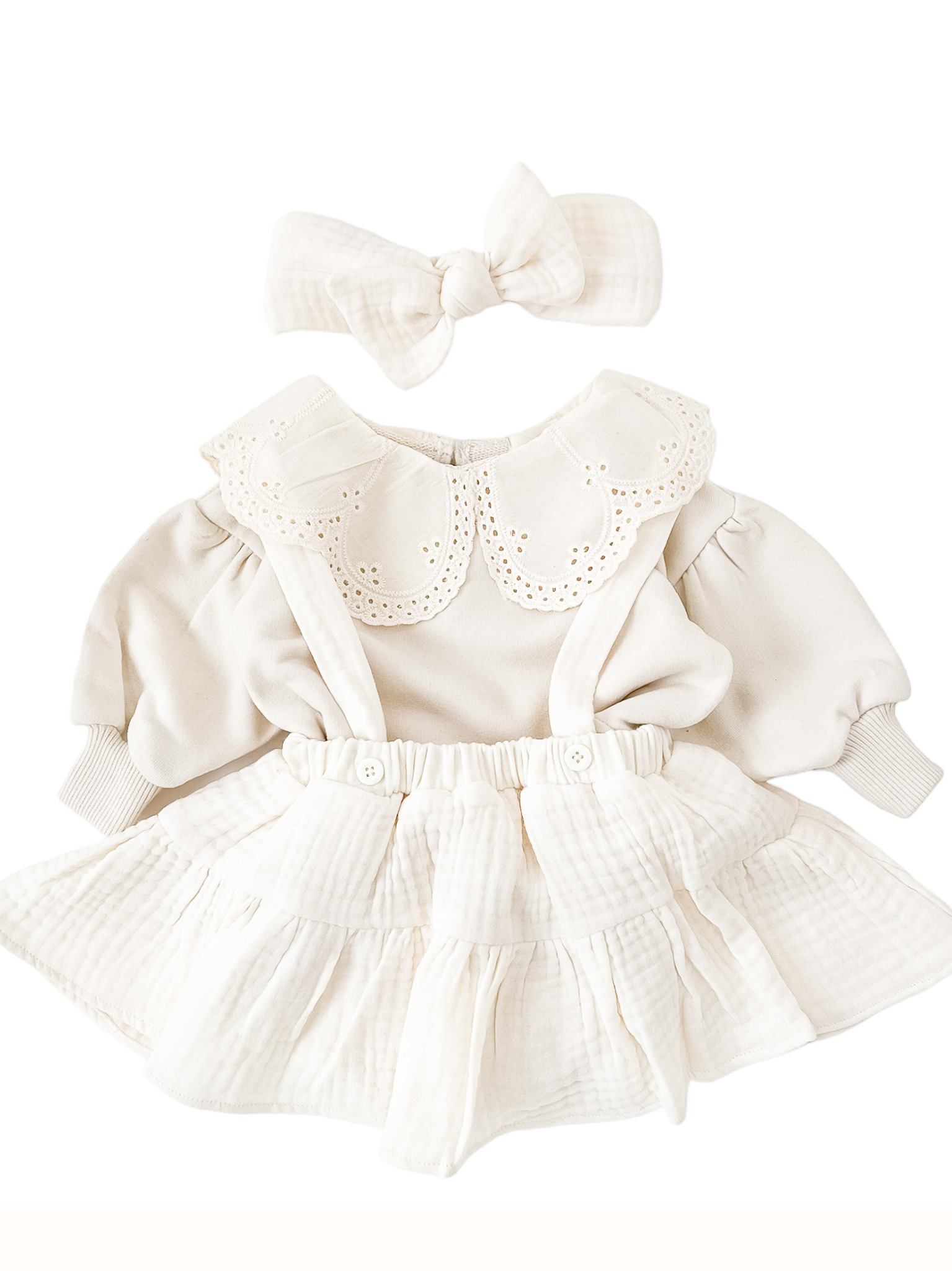 Komplet bluzy z haftowanym kołnierzykiem, spódnicy na szelkach i opaski. Kolor kremowy. Zestaw taniej o 59zł
