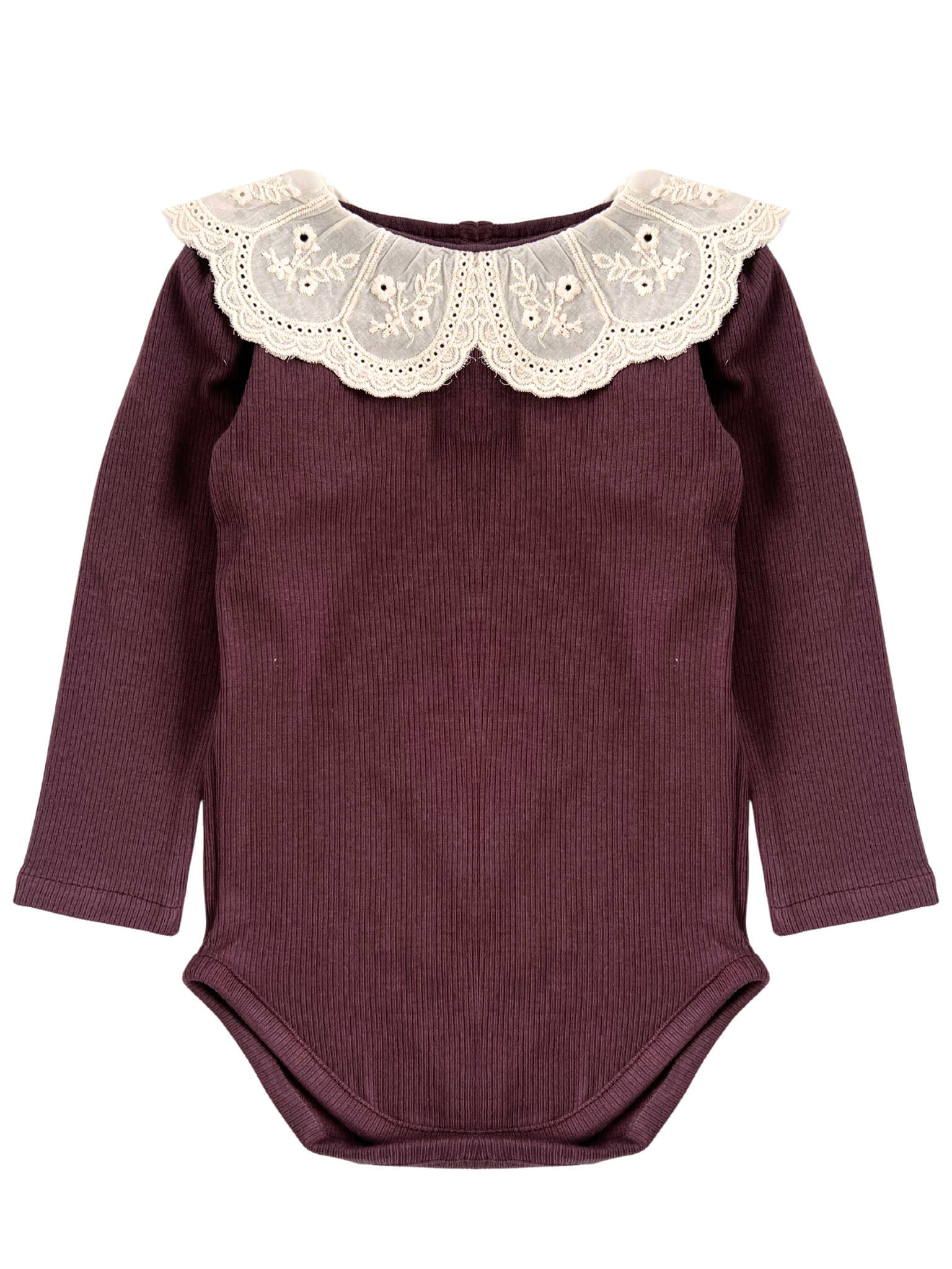 Prążkowane body/bluzka z koronkowym kołnierzykiem -bordowe