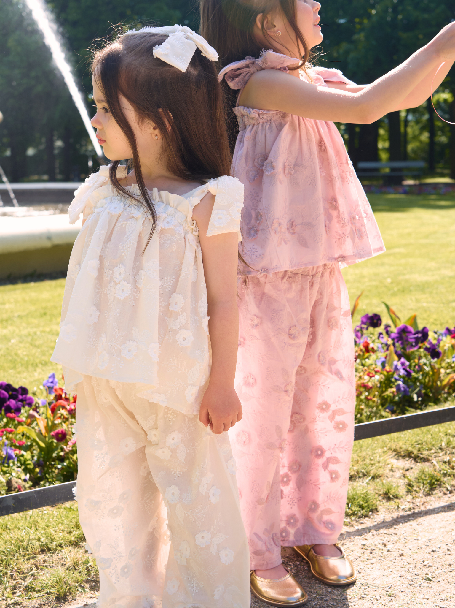 Spodnie kuloty z haftowanego muślinu z kieszeniami.