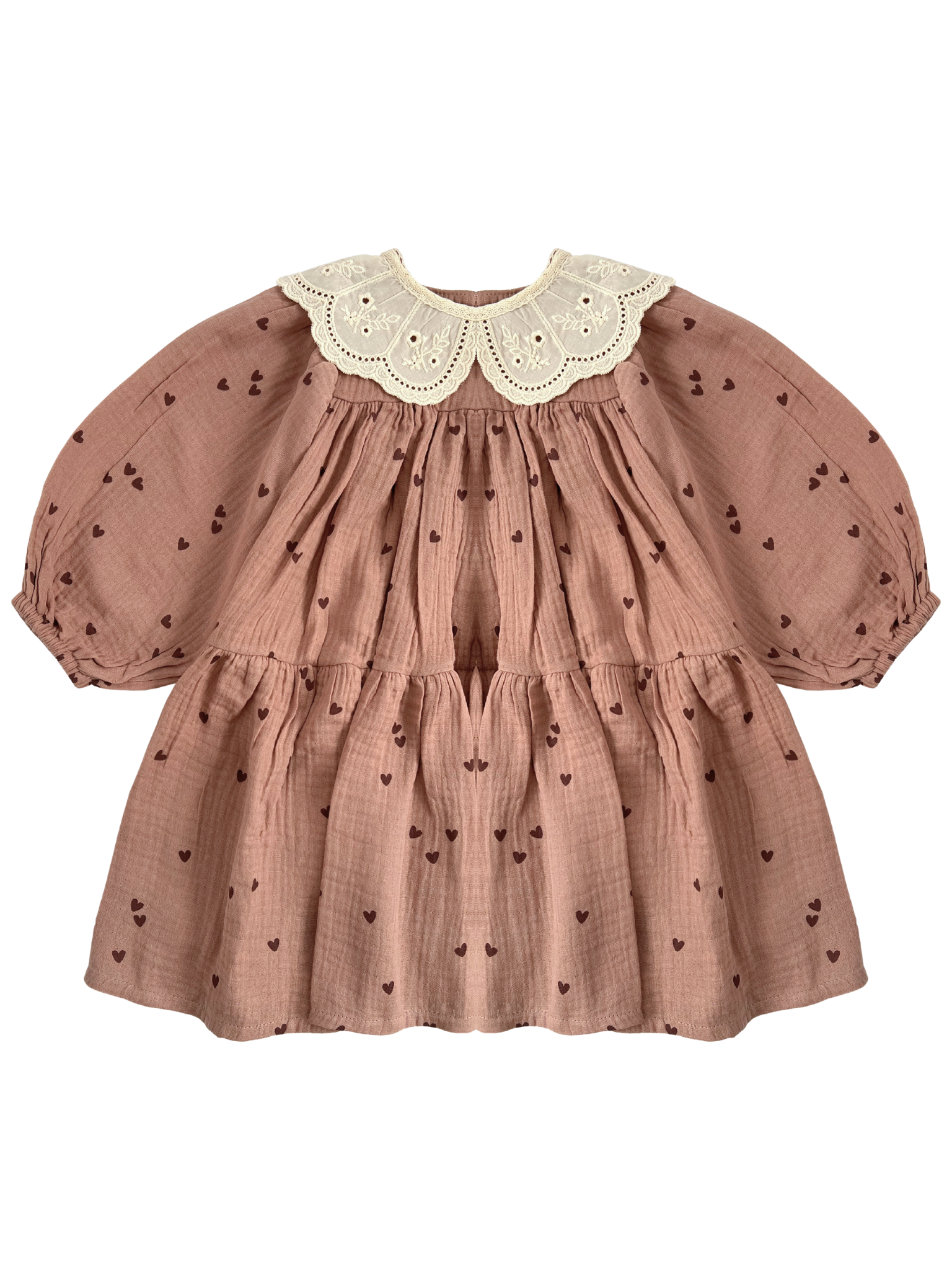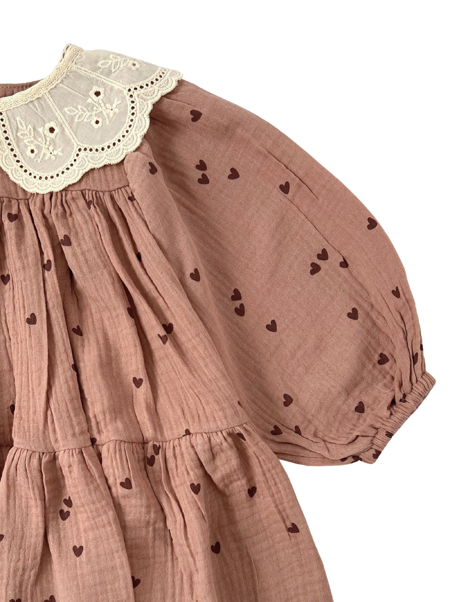 Sukienka muślinowa w kolorze mokka z brązowymi serduszkami.