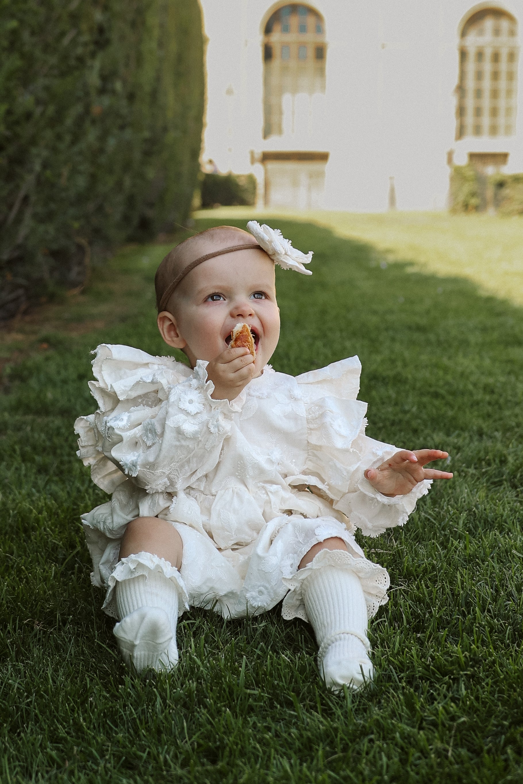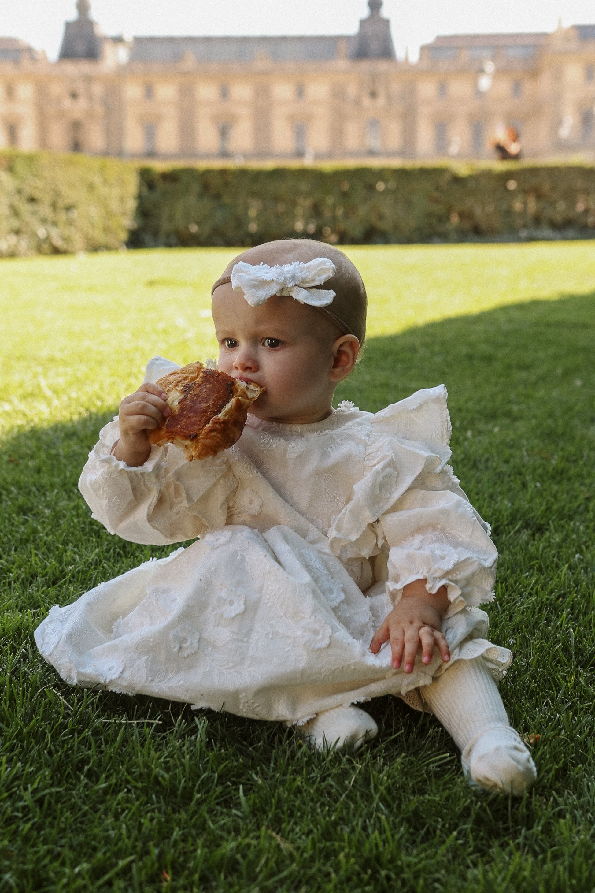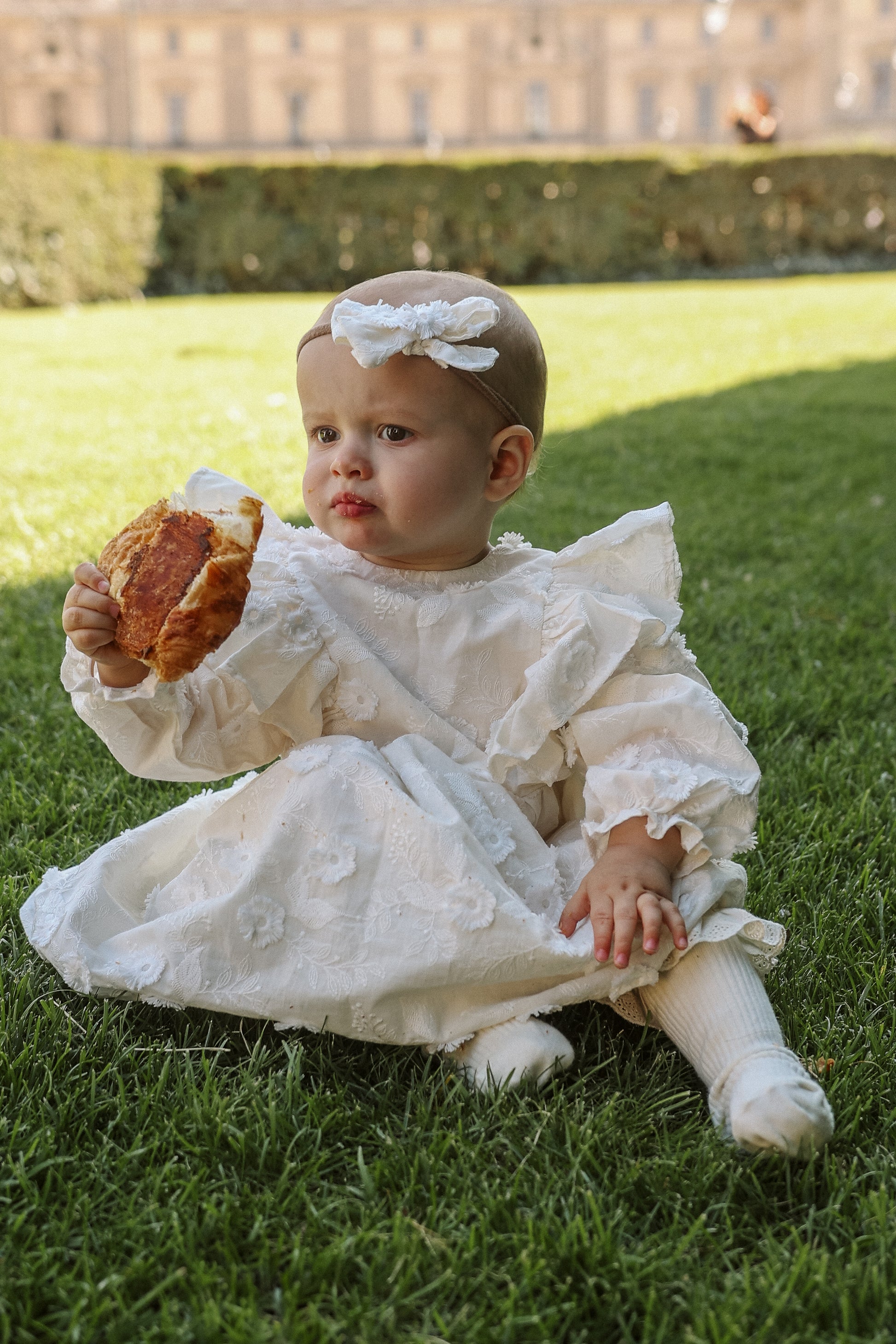 Sukienka na specjalne okazje- z bawełny w haftowane kwiaty, rozkloszowany dół, długi rękaw, delikatne wycięcie na plecach.