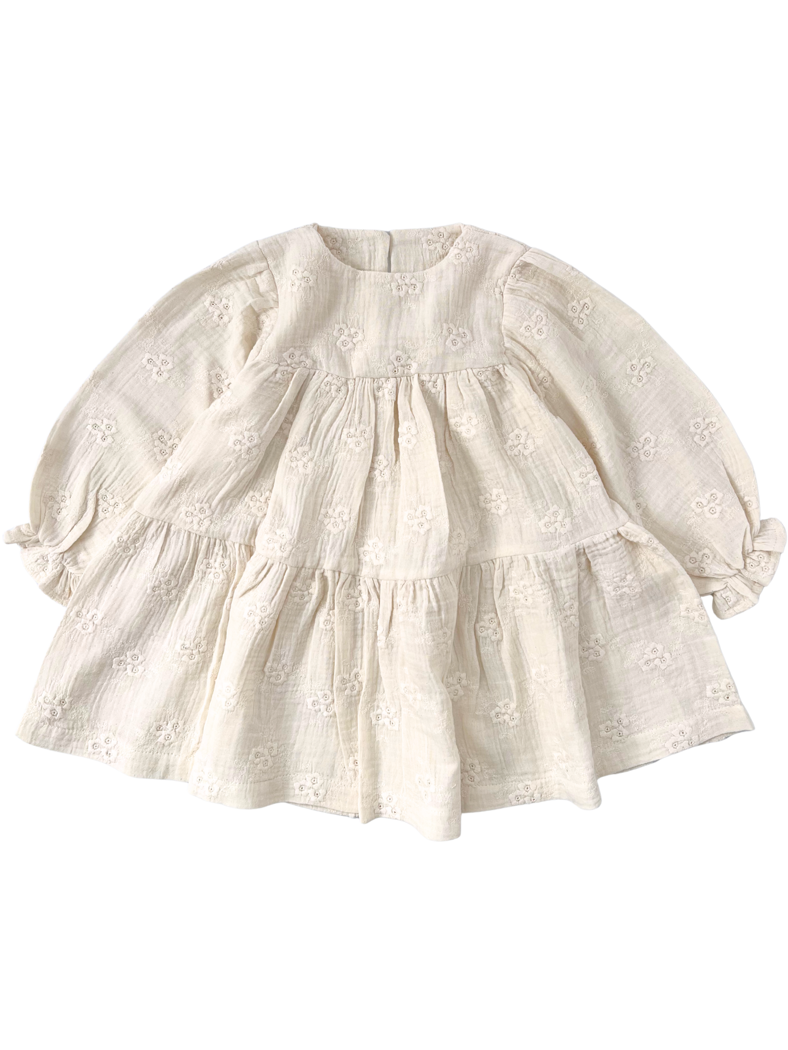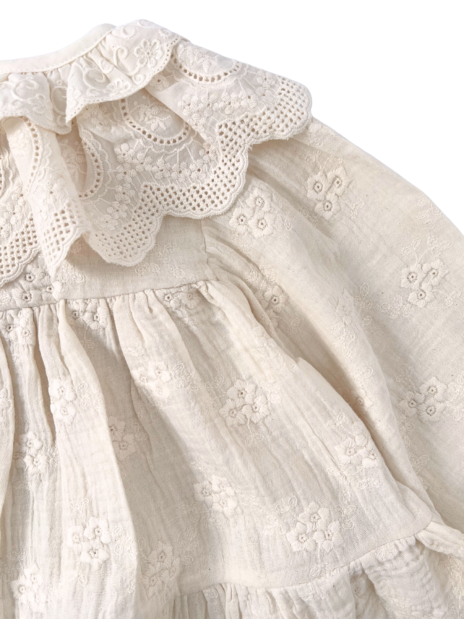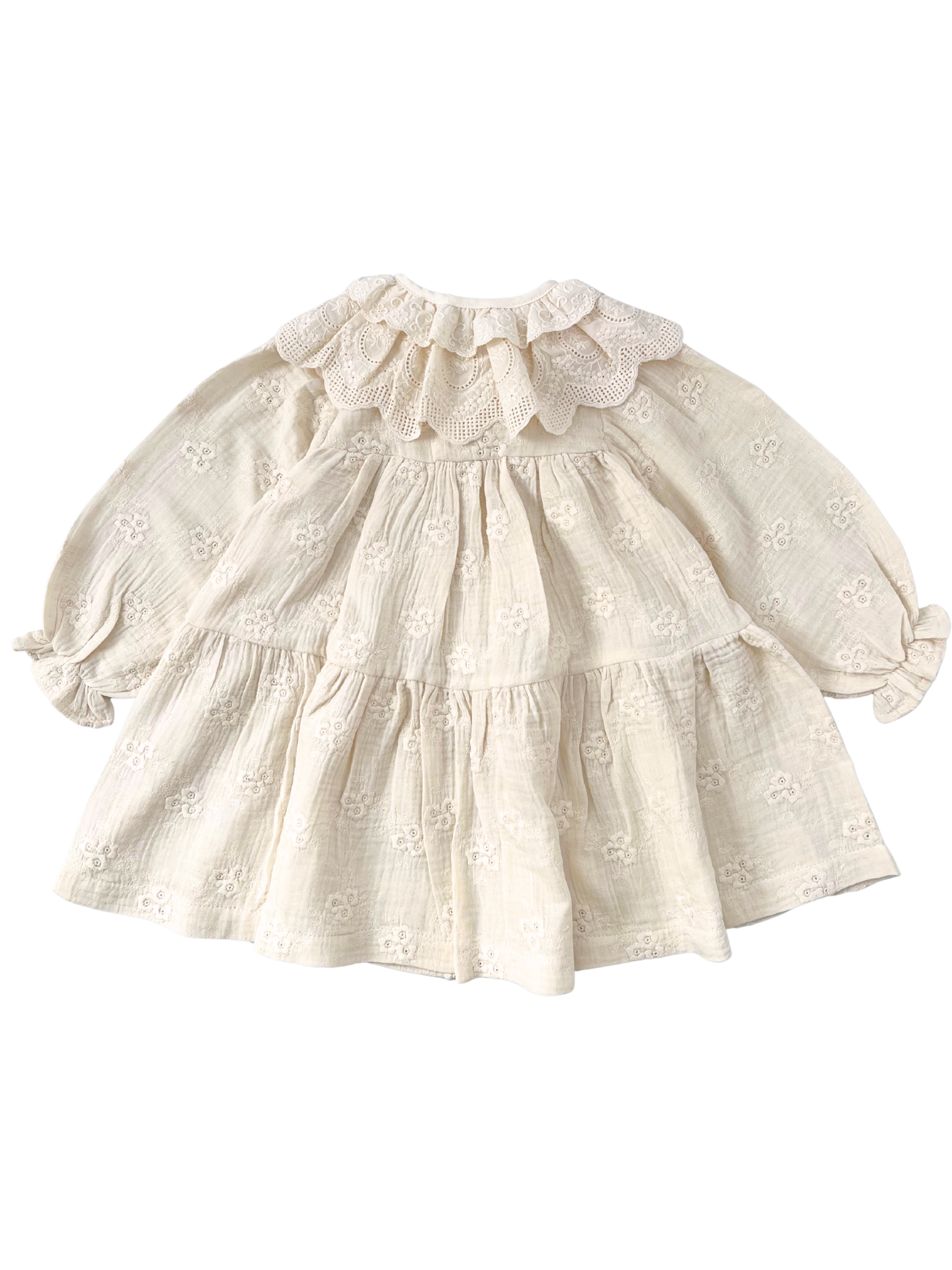 Haftowana sukienka z koronkowym kołnierzem - kremowa